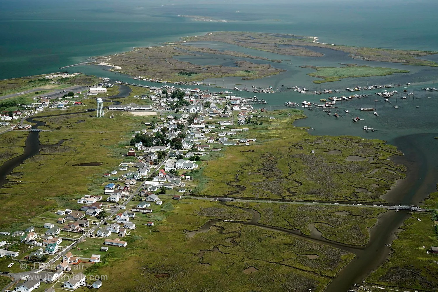 Island of Tangier at mid-tide with half of town standing in water