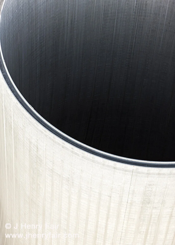 In an hourglass-shaped cooling tower, the iconic landscape element of large steam power plants, hot boiler water is percolated from the top into pools at the bottom, cooling it for recirculation back into the boiler, and releasing clouds of steam. This facility released 40 kg of mercury, 1030 tons of nitrogen oxides (NOx/NO2), 990 tons of sulfur oxides (SOx/SO2), and 3,430,000 tons of carbon dioxide (CO2) in 2016.